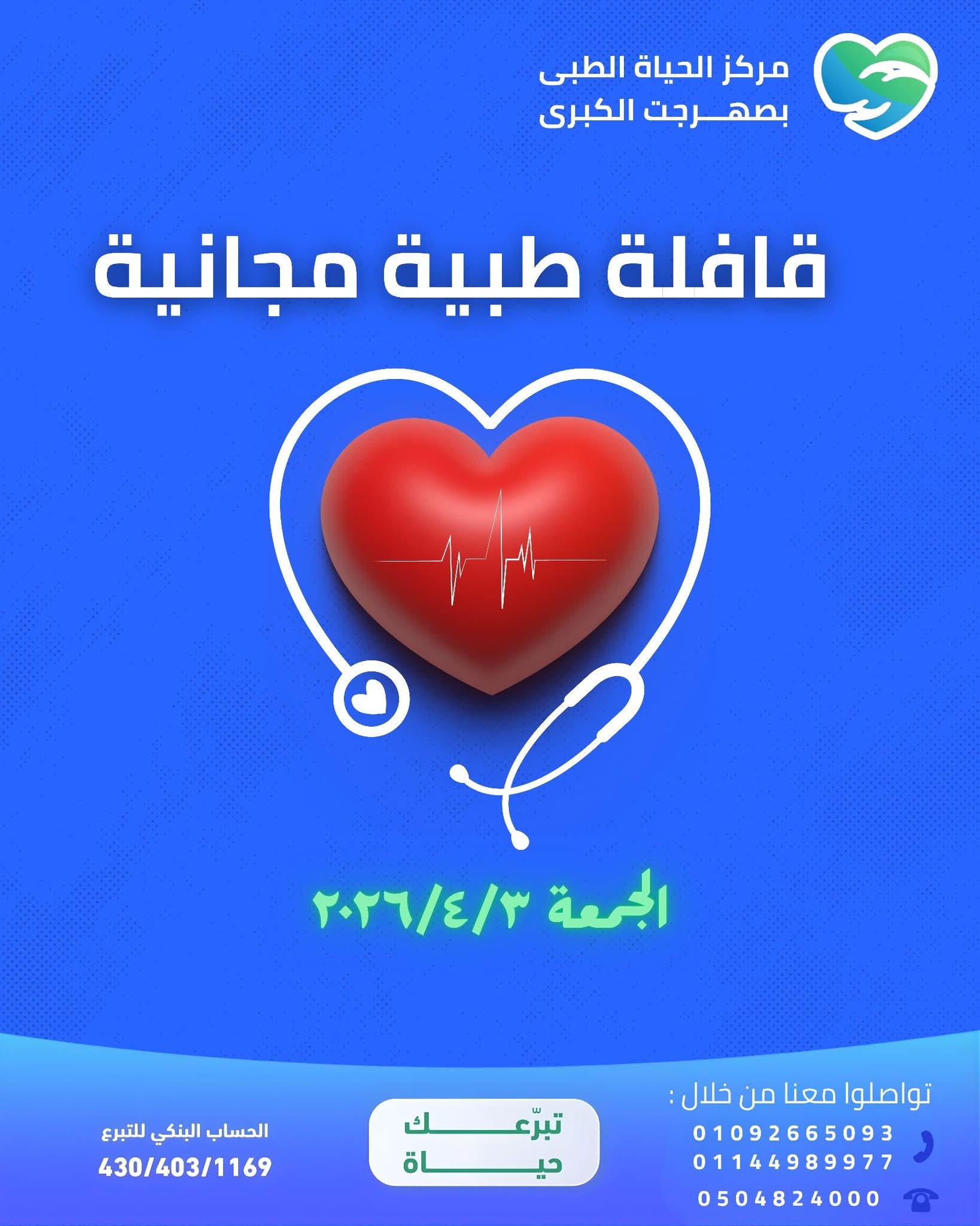 يعلن مركز الحياة الطبي بصهرجت الكبرى عن تنظيم قافلة طبية مجانية شاملة يوم: